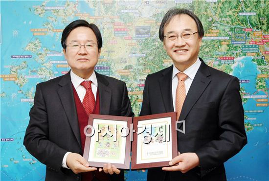 배용태 전남도 행정부지사(왼쪽)가 11일 오전 집무실에서 김용억 대한결핵협회 광주전남지부장(오른쪽)으로부터 크리스마스 씰을 전달받고 있다. 전남도는 결핵퇴치 홍보ㆍ검진 등 결핵관리사업 재원을 마련하기 위해 도 및 22개 시ㆍ군 공직자를 대상으로 3930만원을 모금할 계획이다. 사진제공=전남도노해섭 기자 nogary@<ⓒ세계를 보는 창 경제를 보는 눈, 아시아경제(www.asiae.co.kr) 무단전재 배포금지>