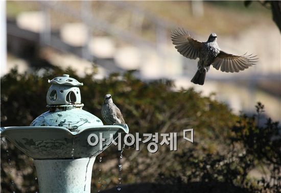 12일 전남 강진군 대구면 청자박물관 작업장 입구의 분수대에 목이 마른 직박구리들이 달려들어 물을 먹느라 부산을 떨고 있다. 사진제공=강진군노해섭 기자 nogary@<ⓒ세계를 보는 창 경제를 보는 눈, 아시아경제(www.asiae.co.kr) 무단전재 배포금지>
