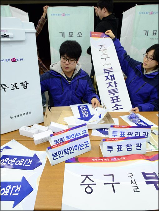 [아시아경제 최우창 기자]제18대 대통령 선거를 일주일 앞둔 12일 서울 을지로6가 중구구민회관 소강당에서 중구선거관리위원회 직원들이 부재자 투표소 설치를 준비하고 있다.최우창 기자 smicer@<ⓒ세계를 보는 창 경제를 보는 눈, 아시아경제(www.asiae.co.kr) 무단전재 배포금지>