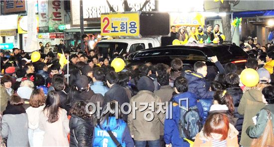 민주통합당 문재인 후보가 13일 오후 광주를 찾아 80년 5.18 광주민주화 운동의 현장인 동구 금남로 전일빌딩 앞에서 지지자들이 문재인을 연호하고 있다. 노해섭 기자 nogary@<ⓒ세계를 보는 창 경제를 보는 눈, 아시아경제(www.asiae.co.kr) 무단전재 배포금지>