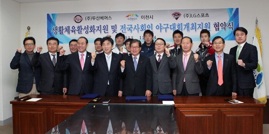 [아시아경제 이종길 기자]잠실 두 가족이 경기도 이천시와 손을 맞잡았다.프로야구 두산과 LG는 14일 이천시청에서 조병돈 이천시장, 전진우 LG 사장, 김승영 두산 사장, 이진영, 임찬규(이상 LG), 김선우, 김현수(이상 두산) 등이 참석한 가운데 이천시 생활체육 활성화 지원과 지역사회 기여 내용을 명시한 협약 체결을 가졌다.LG는 최근 이천시 대월면 일원의 면적 204,344㎡ 부지에 퓨처스리그 경기장과 연습장 및 실내 농구경기장을 갖춘 LG 복합체육시설 조성을 추진하고 있다. 두산도 이천시 백사면 일원의 면적 79,507㎡ 부지에 퓨처스리그 경기장 및 리틀야구장 등 베어스파크를 조성할 계획이다.이날 협약을 통해 이천시는 두 시설을 활용한 야구스포츠 저변확대와 이천시민 건강증진을 모색하는 한편, 전국 최초로 프로야구단의 공동후원으로 ‘전국 사회인야구대회’를 개최하는 것을 협약했다. 이천시장기 전국사회인야구대회(가칭)는 베어스파크, LG복합체육시설 및 준공을 앞둔 이천시 꿈의 구장에서 2014년부터 매년 10월과 11월 펼쳐질 예정이다. 이천시는 이를 지역축제와 연계해 지역경제를 활성화하는 한편 특수성을 살려 건강한 체육도시 조성을 이끌 원동력으로 삼을 계획이다.이종길 기자 leemean@<ⓒ세계를 보는 창 경제를 보는 눈, 아시아경제(www.asiae.co.kr) 무단전재 배포금지>