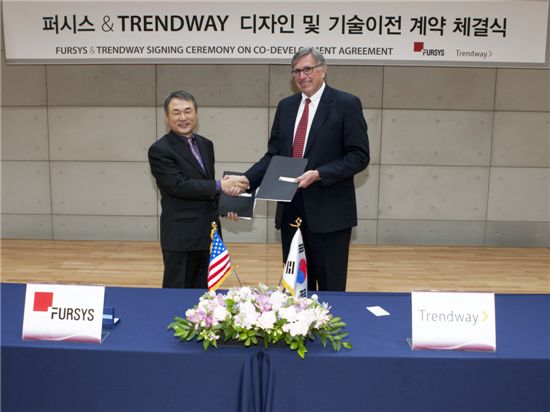 이종태 퍼시스 사장(왼쪽)이 빌 번디 트렌드웨이 사장과 계약 직후 기념사진을 찍고 있다.