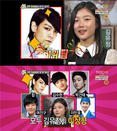 [아시아경제 이금준 기자] 배우 김유정이 그룹 빅뱅의 멤버 탑을 이상형으로 선택했다.김유정은 16일 오후 방송한 MBC '섹션TV 연예통신'에 출연해 자신의 이상형을 공개하는 시간을 마련했다. 김유정의 이상형 1위는 빅뱅의 탑, 2위는 김수현이었다. 이민호가 3위였으며 박건태와 여진구가 4번째에 올랐다.김유정은 자신의 이상형 선택 결과에 대해 "빅뱅의 탑 오빠는 평소에 팬이라서 어쩔 수 없었다"고 밝혀 웃음을 자아냈다.네티즌들은 김유정의 이상형 공개에 "김유정도 어쩔 수 없는 소녀 팬이구나", "부끄러워 하는 모습이 정말 귀여웠다", "의외로 김유정과 탑이 잘 어울리는 듯" 등 다양한 반응을 보였다.한편 김유정은 영화 '호두까기인형 3D'(감독 안드레이 콘찰로프스키)에서 메리의 더빙을 맡았다. 내년 1월 3일 개봉 예정.이금준 기자 music@<ⓒ아시아경제 & 스투닷컴(stoo.com)이 만드는 온오프라인 연예뉴스>