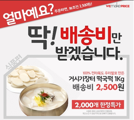[아시아경제 김대섭 기자] 위메이크프라이스가 오는 17일부터 거시기장터 떡국떡(1kg)을 배송비 2500원만 받고 판매하는 '딱! 배송비만 받겠습니다!' 이벤트를 진행한다.이번 행사에서는 떡국떡을 최대 2000개까지 한정특가 판매할 예정이다. 100% 전라북도 우리쌀로 만든 떡이라는 게 회사측 설명이다. 재고소진시에는 정상가격으로 판매할 계획이다. 자세한 내용은 홈페이지(www.wemakeprice.com)를 참고하면 된다. 김대섭 기자 joas11@<ⓒ세계를 보는 창 경제를 보는 눈, 아시아경제(www.asiae.co.kr) 무단전재 배포금지>