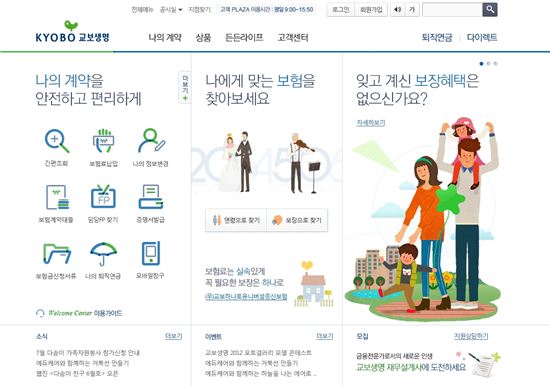[아시아경제 최일권 기자] 교보생명 홈페이지(www.kyobo.co.kr)가 새 단장을 마치고 17일 첫 선을 보였다. 이번 개편은 고객중심 서비스를 강화하기 위한 것으로 메뉴 구성에서 디자인까지 확 바꿨다. 특히 눈에 띄는 부분은 고객들이 가장 많이 사용하는 ‘나의 계약’ 코너다. 홈페이지에 접속하면 바로 계약조회에서 변경, 대출, 보험금신청에 이르기까지 원스톱서비스가 가능하다. 또 보장별로 고객에게 맞는 보험상품도 추천하고 보험료 및 보장 내용 등 상품 비교 기능도 더했다.기존에 나눠져 있던 퇴직연금?다이렉트 홈페이지를 하나로 통합해 고객 접근성을 높였다. 컴퓨터 운영체제, 웹 브라우저에 상관 없이 홈페이지에 접속할 수 있을 뿐 아니라 태블릿PC, 스마트폰 등 모바일 환경에서도 접근이 가능하다.최일권 기자 igchoi@<ⓒ세계를 보는 창 경제를 보는 눈, 아시아경제(www.asiae.co.kr) 무단전재 배포금지>