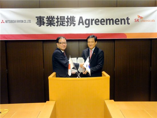 이문석 SK케미칼 그린케미칼 사업 부문 대표가 타테바야시 미쓰비시레이온 취체역과 사업 협력 체결 후 악수를 나누고 있는 모습.