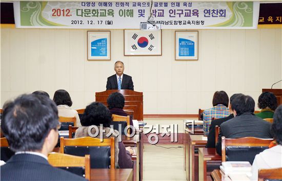 전남 함평교육청(교육장 김승호)은 지난 17일 교육청 대회의실에서 초· 중학교 교감 및 업무담당자 19명이 참석한 가운데 “2012 다문화교육의 이해 및 학교 인구교육 연찬회” 실시했다.이날 김향희 함평 해보초등학교 교감을 초청, 다문화사회 글로벌인재 확보 방안과 농촌 소규모학교에 적합한 맞춤형 인구교육, 가족 친화적 가치관 형성 인구 교육, 다문화가정 학생지원 사업 결과,2013년 다문화교육 지원 계획에 대한 내용으로 강의가 진행됐다.노해섭 기자 nogary@<ⓒ세계를 보는 창 경제를 보는 눈, 아시아경제(www.asiae.co.kr) 무단전재 배포금지>