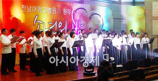 전남대학교병원(병원장 송은규)이 환우와 함께하는 송년의 밤을 지난 20일 전남대병원 명학홀에서 개최했다. 환자, 직원, 시민 등 500여명이 참가한 가운데 열린 이날 행사는 리모델링 준공 등 1년간 전 직원이 땀 흘려 온 노고를 격려하고, 오는 새해에는 병원발전을 위해 더욱 노력할 것을 다짐했다.이날 행사는 병원직원들의 노래와 춤, 조성모를 비롯한 가수들의 공연 등 다채로운 프로그램으로 진행됐다. 특히 조성모의 공연에서는 참가자 모두가 노래와 율동을 따라하며 분위기가 한껏 고조됐다.송 원장은 이날 인사말을 통해 “환자중심 스마트병원을 실현하기위해 전 직원이 열심히 달려왔고, 특히 리모델링을 통해 낡고 비좁았던 공간을 넓고 쾌적하게 만들었으며 환자들이 쉽고 빠르고 편하게 진료 받을 수 있는 최첨단 시스템도 갖추게 됐다” 면서 “소통과 화합으로 갈등과 분열을 해소하고 새로운 기분으로 계사년의 새해를 맞이해 전남대병원의 발전을 이어가자”고 당부했다.노해섭 기자 nogary@<ⓒ세계를 보는 창 경제를 보는 눈, 아시아경제(www.asiae.co.kr) 무단전재 배포금지>