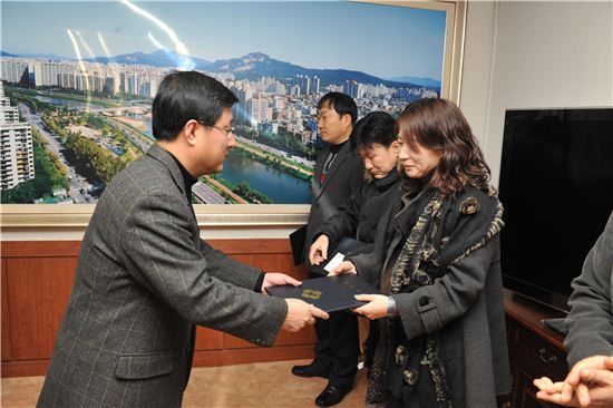 김성환 노원구청장(왼쪽)이 수상자에게 표창장을 주고 있다.