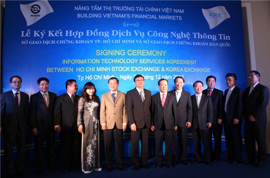 한국거래소는 26일 베트남 호치민증권거래소에서 호치민증권거래소와 차세대 증권시장시스템 구축 계약을 체결했다. 왼쪽부터 권오문 한국예탁결제원 전무, 융 나옵 뚜안 베트남예탁원 부사장, 응엔 부 꽝 쭝 하노이증권거래소 부사장, 판 띠 뚜옹 땀 호치민증권거래소 사장, 쩐 닥 신 호치민증권거래소 이사장, 부 방 베트남증권관리위원회 위원장, 김봉수 한국거래소 이사장, 하찬호 주베트남 대사, 우주하 코스콤 사장, 오경수 현대정보기술 대표, 조영천 코오롱베니트 대표, 박상찬 한국거래소 사외이사.