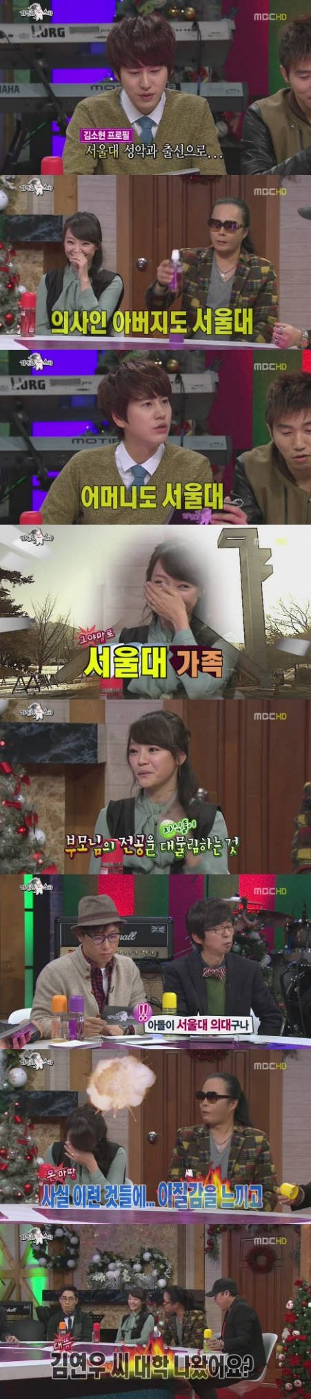 [아시아경제 장영준 기자]뮤지컬 배우 김소현의 가족이 모두 서울대 출신이라는 사실이 밝혀져 진정한 엄친딸의 면모를 과시했다.지난 26일 방송된 MBC '황금어장-라디오스타'에서는 MC 규현이 인지도가 낮은 김소현을 위해 프로필을 소개했다.규현이 공개한 프로필에 따르면 김소현은 서울대 성악과 출신. 의사인 김소현의 아버지 역시 서울대 출신이었고, 어머니도 김소현과 같은 과를 졸업했다. 또 남동생 역시 아버지의 발자취를 따라 서울대 의대를 나온 것으로 밝혀져 모두를 놀라게 했다.이에 김태원은 몹시 놀라는 한편 "사실 이런 것들에 이질감을 느낀다"고 말해 웃음을 자아냈다. 이어 대뜸 함께 출연한 김연우에게 "대학 나왔어요?"라고 물어 그를 당황시켰다. MC들은 "김연우는 현재 교수님이다"라고 옹호했지만, 김태원은 전혀 동요하지 않는 모습으로 다시 한 번 큰 웃음을 선사했다.한편, 이날 방송에는 '위대한 탄생3'의 멘토 4인방 김태원 김연우 김소현 용감한 형제가 출연해 재치있는 입담을 과시했다.장영준 기자 star1@<ⓒ아시아경제 & 스투닷컴(stoo.com)이 만드는 온오프라인 연예뉴스>