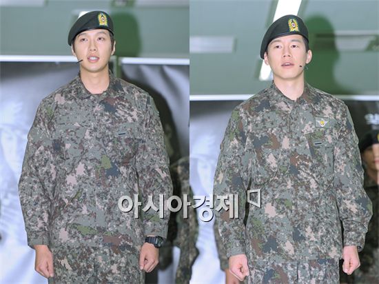 [아시아경제 김재범 기자]올 초 군에 입대한 배우 지현우와 김무열이 군인의 모습으로 오랜만에 모습을 드러냈다.27일 오후 2시 서울 올림픽공원 우리금융아트홀 대연습실에서 6.25 정전 60주년 군 창작 뮤지컬 ‘프라미스’(The Promise)의 연습현장이 공개됐다.'프라미스'는 6.25 전쟁 초기 북한군의 남침부터 개성-문산 전투, 화령장 전투에 이어 6.25 전쟁 당시 가장 치열한 격전지였던 다부동 전투까지, 긴박했던 전쟁 상황에서 생사고락을 함께 한 전우 7명의 얘기를 그린다.전쟁 경험이 없는 어린 소대장 지훈 역을 맡은 이병 지현우(본명 주형태)는 “지훈은 우유부단한 선택으로 소대원들을 위기에 빠뜨리지만 차츰 변화된 모습 보여주는 인물”이라며 “정전 60주년이 흘렀다. 많은 분들이 한국전쟁을 잊은 것 같다. 호국영령들의 희생을 알리고 싶다”고 뮤지컬 참여 소감을 전했다.군 면제 논란 후 무혐의 처분을 받았지만 자진 입대로 귀감을 산 이병 김무열은 이번 작품에서 말 못할 과거를 지니고 있으며 자기 생존이 우선인 호전적인 인물 상진 역을 맡았다. 그는 “군인 정신으로 열심히 하고 있다. 군 작품이 아닌 일반 창작 작품으로 봐 달라”고 소개했다.(좌) 이현 (우) 이특