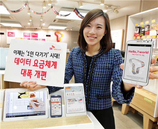 [아시아경제 김보경 기자] SK텔레콤(대표 하성민)은 LTE 스마트폰의 데이터를 다른 기기와 나눠쓰는 데이터 공유 요금제를 출시하고 기존 데이터 전용 요금제를 통합·개편했다고 30일 밝혔다. 또 내년 초 선불식 데이터 충전 요금제를 도입하고 와이파이 유료상품 가격을 낮출 방침이다. SK텔레콤은 LTE폰 요금제의 기본제공 데이터를 같은 명의로 가입한 데이터 기기와 나눠 쓸 수 있는 'LTE 데이터 함께쓰기 요금제'를 31일 출시한다. LTE 스마트폰 기본료 34000원 요금제 이상 가입자는 누구나 이용할 수 있으며 하나의 스마트폰 회선에 최대 5개 기기까지 연결 가능하다. 단, 청소년 요금제인 'LTE 팅 요금제' 가입자는 제외된다. 데이터 함께쓰기 요금제 종류는 데이터 제공량에 따라 베이직, 1GB, 2.5GB 등 총 세 가지다. 베이직 요금제는 월 이용료 8000원(24개월 약정시)으로 데이터 기본제공 없이 LTE 스마트폰 데이터량을 공유해 쓰는 요금제다. 데이터 기기를 신규 개통하면서 베이직 요금제에 가입할 때는 추가 가입비를 지불하지 않아도 된다.