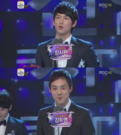[아시아경제 장영준 기자]그룹 제국의 아이들 임시완과 개그맨 김두영이 시트콤 코미디 부문 신인상을 수상했다.9일 오후 서울 영등포 여의도 MBC에서 열린 2012 MBC 방송연예대상에서 임시완과 김두영이 시트콤 코미디 부문 신인상 수상자로 선정됐다.임시완은 시트콤 '스탠바이'에서 진행(류진)의 집에 얹혀사는 고등학생 시완을 연기했으며, 김두영은 '코미디가 빠지다'에 출연 중이다.장영준 기자 star1@<ⓒ아시아경제 & 스투닷컴(stoo.com)이 만드는 온오프라인 연예뉴스>
