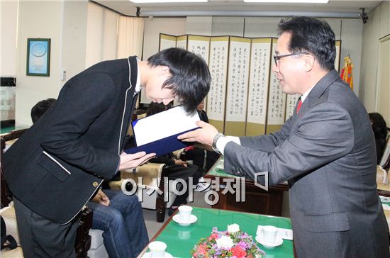 광주광역시 동구청(청장 노희용)은 28일 3층 접견실에서 관내 저소득 자녀 중 학업성적이 우수하고 품행이 바른 중·고등 학생 8명에게 240만원의 장학금을 전달했다. 사진제공=광주시 동구노해섭 기자 nogary@ <ⓒ세계를 보는 창 경제를 보는 눈, 아시아경제(www.asiae.co.kr) 무단전재 배포금지>