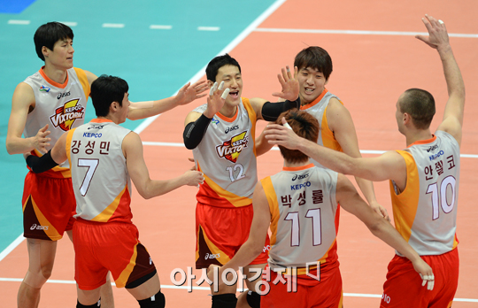 [인천=아시아경제 정재훈 기자] 30일 오후 인천 도원실내체육관에서 열린 'NH농협 2012~2013 V리그' 대한항공과 KEPCO의 경기에서 마틴의 스파이크를 블로킹한 장광균이 동료들과 기뻐하고 있다.정재훈 기자 roze@<ⓒ세계를 보는 창 경제를 보는 눈, 아시아경제(www.asiae.co.kr) 무단전재 배포금지>정재훈 사진기자 roze@<ⓒ아시아 대표 석간 '아시아경제' (www.newsva.co.kr) 무단전재 배포금지>