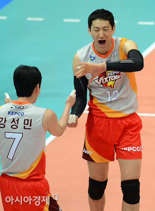 [인천=아시아경제 정재훈 기자] 30일 오후 인천 도원실내체육관에서 열린 'NH농협 2012~2013 V리그' 대한항공과 KEPCO의 경기에서 마틴의 스파이크를 블로킹한 장광균이 기뻐하고 있다.정재훈 기자 roze@<ⓒ세계를 보는 창 경제를 보는 눈, 아시아경제(www.asiae.co.kr) 무단전재 배포금지>정재훈 사진기자 roze@<ⓒ아시아 대표 석간 '아시아경제' (www.newsva.co.kr) 무단전재 배포금지>