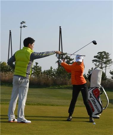 [아시아경제 김현준 골프전문기자, 손은정 기자] 대부분의 여성골퍼들은 일단 아름다운 스윙을 하고 싶어 한다.여기서 '아름다운 스윙'이란 무엇일까. 여성골퍼들은 아마도 스윙 폼이 깔끔하기를 원할지도 모른다. 하지만 여성이든 남성이든 체형에 따라 스윙은 천차만별이다. 프로골퍼들도 마찬가지다. 그래야 공도 잘 맞는다. "클럽이 다니는 길이 따로 있다"는 말이 있다. 스윙의 기본 원리를 이해하고, 이에 따른 원칙을 잘 지켜야 아름다운 스윙을 만들 수 있다. ▲ 머리 움직여서 '뒤땅'= 신수지와 함께 라운드하면서 가장 자주 일어나는 문제가 바로 뒤땅이었다. 보통 뒤땅이라 하면 아이언 샷에서 대부분 발생하지만 신수지는 드라이브 샷에서도 생겼다. 머리 움직임이 가장 큰 원인이었다. 머리가 오른쪽으로 많이 밀리는 모습이다. 당연히 척추의 움직임이 많아지고, 정확한 임팩트를 할 수 없어진다. 스윙은 생각이 지배한다. 신수지는 스윙에 대한 이론부터 재점검할 필요가 있다. 신수지의 스윙이미지는 이랬다. 하체를 최대한 고정시킨 후 어깨 회전으로 몸통의 꼬임을 크게 하고 비거리를 내기 위해 오른쪽으로 체중을 이동해야 한다는 생각이다. 하지만 이렇게 되면 <사진1>처럼 스윙과정에서 어드레스 때보다 머리 위치가 오른쪽으로 많이 치우치게 된다.[사진1] 머리가 오른쪽으로 움직이면 정확한 임팩트가 어렵고 비거리 손실도 크다.(X)