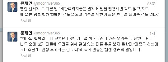 [아시아경제 김승미 기자]문재인 전 민주통합당 대선 후보가 대선 패배 후 ‘트위터 정치’로 몸풀기에 나섰다. 자신의 대선 패배에 대한 비판을 비유적인 표현으로 응수하기도 했다. 문 전 후보는 2일 오후 자신의 트위터에 ‘내 인생 후회되는 한가지’ 책 속에 인용된 헬렌켈러의 말을 언급하며 “하나의 행복의 문이 닫히면 다른 문이 열린다. 그러나 가끔 우리 그 닫힌 문만 너무 오래 보기 때문에 우리를 위해 열려있는 다른 문을 보지 못한다”는 글을 남겼다. 이어 “비관주의자들은 별의 비밀을 발견해낸 적도 없고, 지도에 없는 땅을 향해 항해한 적도 없으며 영혼을 위한 새로운 천국을 열어준 적도 없다”고 덧붙였다. 문 전 후보가 남긴 글은 이날 자신을 향해 쓴 소리를 한 법륜 스님의 비판과 맞물리면서 미묘한 파장을 일으키고 있다. 그의 글에 등장한 ‘비관주의자’가 법륜 스님을 지칭한 것이 아니냐는 해석이다. 법륜 스님은 이날 한 라디오 방송에 출연해 “안철수 후보로 단일화됐다면 이기고도 남는 선거 였다”고 비판했다. 아울러 문 전 후보의 트윗이 “자신이 대선에서 패배했다는 결과만 보고 야권 사상 최대인 1470만표(48%)의 지지를 얻은 것에는 눈감고 있는 것에 대한 불편한 심경을 글에 담아낸 것이 아니냐”는 뜻으로도 읽힌다는 견해도 적지 않게 나오고 있다.김승미 기자 askme@<ⓒ세계를 보는 창 경제를 보는 눈, 아시아경제(www.asiae.co.kr) 무단전재 배포금지>
