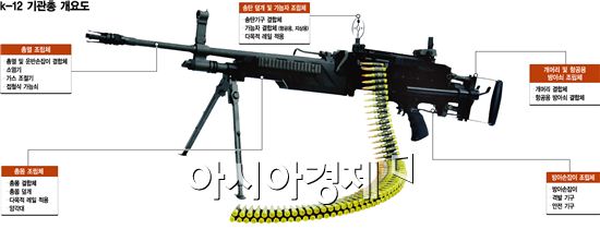 공정라인을 지나 조립동으로 들어가니 드디어 우리군이 사용하는 각종 소총들이 한눈에 들어왔다. 한쪽에는 한국형 기동헬기 '수리온'에 장착할 K12기관총도 듬직하게 조립동을 체우고 있었다. 회사 관계자는 K12기관총을 가리키며 "항공기용 개머리, 지지대 등을 포함해 부품수만 140여개"라면서 "다른 소총에 비해 부품도 많은 만큼 품질검사만 30%정도 더 한다"고 말했다. K-12는 항공기가 지상에 착륙하면 항공기지지대와 분리해 보병들이 사용할 수 있다. 항공기 탑재용과 지상용 모두 사용이 가능하다. 세계에서 유일한 기술이다. 장점은 또 있다. 총열은 손잡이만 돌려 교체하면 된다. 기존 M60의 경우 분당 550~600발을 쏘고나면 총신을 바꿔야 한다. 하지만 손잡이가 없어 장병들은 뜨거운 총열을 직접 만져야 했다. K12는 손잡이가 있어 안전성과 신속성도 더 했다. 특히 K-12는 화염이 적어 야간사격때도 적에게 노출이 적고 완충시스템을 장착해 사격시 진동이 M60의 10%에 불과해 장병들의 피로도가 훨씬 덜하다. 또 분대 지원기관총인 K3가 5.56mm 탄환을 사용하는 데 비해 K12는 7.62mm 탄환을 쏘는 만큼 파괴력이 커 훨씬 강력한 화력을 쏟아낼 수 있다는 게 장점이다. 하 팀장은 "전차 탑재용 등을 추가로 개발할 경우 다른 K-12 기관총들과 부품을 교환 할 수 있어 전시에 효과적으로 전투준비태세를 할 수 있다"고 말했다.