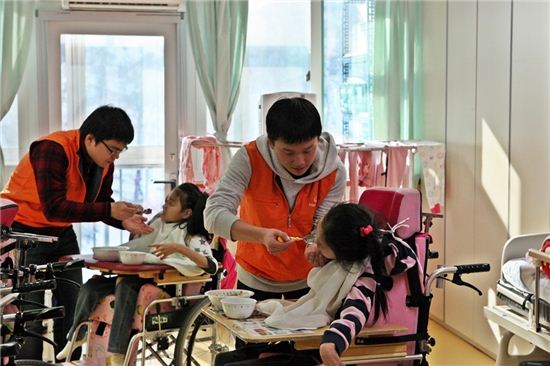 한화손해보험 신입사원들이 장애인들의 점심 식사를 돕고 있다.