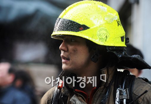 [아시아경제 백소아 기자] 9일 서울 중구 충무로 인쇄골목 한 인쇄소에서 발생한 화재가 진압된 후 한 소방대원이 안도의 한숨을 내쉬고 있다.백소아 기자 sharp2046@<ⓒ세계를 보는 창 경제를 보는 눈, 아시아경제(www.asiae.co.kr) 무단전재 배포금지>