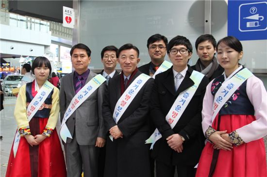 정대종(앞줄 왼쪽에서 3번째) 코레일유통 사장 등 임직원들이 새해 초 서울역에서 열차손님들에게 명절인사를 하고 있다.