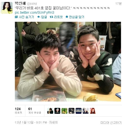 [아시아경제 황원준 기자]배우 박신혜가 드라마에서 연기 호흡을 맞추고 있는 두 배우, 김지훈-고경표의 귀여운 모습을 포착했다. 박신혜는 14일 자신의 트위터에 "우리가 바로 401호 꽃미남이다"라는 글과 더불어 김지훈, 고경표의 사진 한 장을 게재했다.사진 속 두 사람은 엎드려 손으로 턱을 괸 채 깜찍한 표정을 짓고 있는 모습이다. 특히 김지훈은 고경표와 9살 나이 차이가 남에도 불구하고, 전혀 뒤쳐지지 않는 '꽃미모'로 네티즌들의 이목을 집중시켰다. 이를 접한 네티즌들은 "옆집으로 이사 가고 싶다" "김지훈 고경표 10살 차이라는 게 안 믿긴다" "박신혜의 귀여운 복수" "이웃집 꽃미남 배우들끼리 진짜 친한 듯" 등 다양한 반응을 보였다.한편 박신혜, 김지훈, 고경표는 방영 중인 케이블채널 tvN '이웃집 꽃미남'을 통해 연기 호흡을 맞추고 있다. 박신혜는 기존의 발랄한 이미지를 벗고 '은둔형 외톨이' 고독미 역을 맡았고, 김지훈은 '현실형 꽃미남' 웹툰 작가 오진락으로 분해 열연을 펼치고 있다. 아울러 고경표는 김지훈의 집에 더부살이 하는 어시스턴트 유동훈으로 활약 중이다. '이웃집 꽃미남'은 웹툰 '나는 매일 그를 훔쳐본다'를 원작으로, 현대인의 엿보기 심리를 유쾌하고 발랄하게 풀어낸 16부작 로맨틱 코미디 드라마로 매주 월, 화 오후 11시에 방송된다.황원준 기자 hwj1012@<ⓒ아시아경제 & 스투닷컴(stoo.com)이 만드는 온오프라인 연예뉴스>