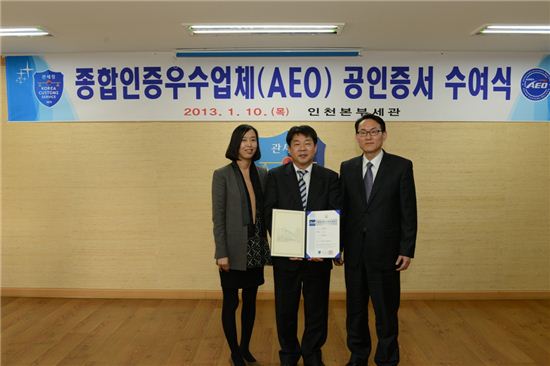 DHL코리아 정상훈 부사장이 지난 10일 인천세관에서 관세청으로부터 '화물운송주선업자' 부문 AEO인증서를 수여 받았다. (왼쪽부터 윤소영 부장, 정상훈 부사장, 정인호 부장)