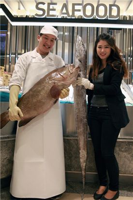 [아시아경제 이초희 기자]AK플라자는 민족 대명절 설을 앞두고 국내에서 보기 드문 기네스급 수산물을 전시 판매한다.AK플라자는 분당점 AK푸드홀에서 제주도 성산포에서 낚시(채낚기)로 잡아 올린 왕갈치를 선보였다. 웬만한 성인 남자 키와 맞먹는 크기로 최고 큰 갈치는 길이 1m 76cm에 무게는 4.8kg에 달한다. 중량 16kg에 달하는 대형 제주 다금바리도 함께 전시 판매 중이다.이 밖에 18일부터 2013년 새해맞이 생물갈치 2013마리를 1만원 기획 균일가에 판매한다.이초희 기자 cho77love@<ⓒ세계를 보는 창 경제를 보는 눈, 아시아경제(www.asiae.co.kr) 무단전재 배포금지>