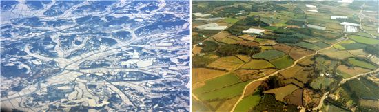 [아시아경제 조용준 기자]서울을 비롯한 전국적으로 포근한 날씨를 보인 지난 13일 서울행 비행기에서 바라본 한반도의 풍광이 묘한 대조를 보이고 있다. 기온이 영하권에 있는 중부권(왼쪽)은 눈이 녹지 않아 그대로 쌓여 있는 반면 따뜻한 제주는 파릇파릇한 조각보 들녘이 싱그롭다. 조용준 기자 jun21@<ⓒ세계를 보는 창 경제를 보는 눈, 아시아경제(www.asiae.co.kr) 무단전재 배포금지>