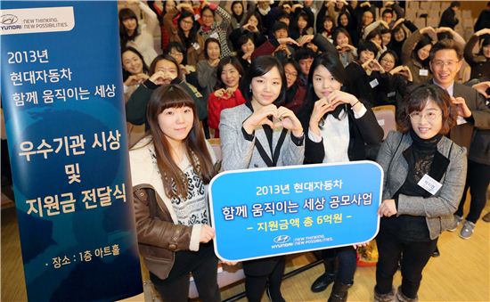 [아시아경제 조슬기나 기자]현대자동차는 15일 서울 동작구에 위치한 서울여성플라자에서 회사 관계자 및 공모사업 심사·자문단, 사업 선정기관 관계자 등 총 100여 명이 참석한 가운데 ‘2013년 현대차 함께 움직이는 세상 공모사업’ 지원금 전달식을 가졌다. 조슬기나 기자 seul@<ⓒ세계를 보는 창 경제를 보는 눈, 아시아경제(www.asiae.co.kr) 무단전재 배포금지>