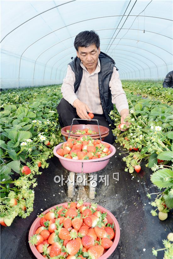 한 겨울에 먹음직스럽게 딸기가 빨갛게 익어가고 있다. 요즘 전남 순천시 외서면 딸기 하우스에서 농민들이 딸기 수확으로 바쁜 시간을 보내고 있다.