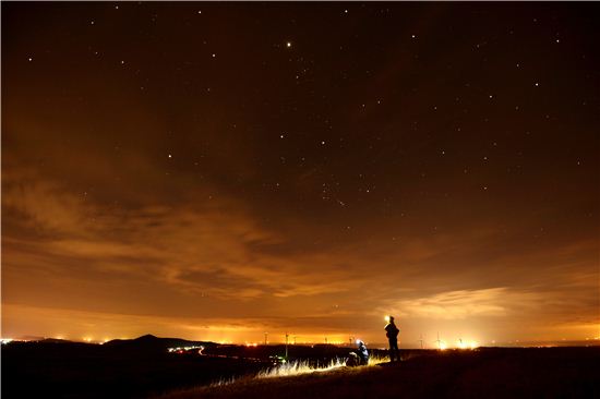 하늘은 구름 한 점 없이 맑고 상쾌하다. 별들도 하나 둘 자리를 잡고 초롱 초롱 이야기를 나누는 듯 하다.중간에 다소 가파른 나무계단이 나오지만 쏟아지는 별빛과 침잠에 빠진 주변 오름들의 풍광에 취해 '놀멍 쉬멍' 걷다 보면 쉽게 오를 수 있다. 올레길을 처음 두 발로 걸었을 때 느린 속도가 보여 준 제주의 아름다움을 기억하고 있다면, 야간 오름을 올랐을 때의 감격 또한 그 못지않을 만큼 감동적이다.영주산에서 만난 이성건(남양주ㆍ50)씨는 "낮에 올랐던 오름과는 비교할 수 없을 만큼 별과 함께하는 밤의 오름은 이색적이고 아름답다."면서"어선들의 불빛과 오름군락의 실루엣이 특히 장관이다"고 즐거워했다. 30여분을 올라 정상에 섰다. 앞쪽으로 성읍마을의 아기자기한 불빛들이 따뜻하게 가슴속으로 파고든다. 멀리 서쪽으로 눈을 돌리자 봉긋 봉긋한 오름군락이 실루엣으로 시야에 들어오고 한라산의 거대한 곡선이 손에 잡힐 듯 지척이다. 동쪽으로 시선을 주자, 거대한 풍력발전기가 힘차게 돌고 그 뒤쪽으로 성산일출봉이 한 눈에 잡힌다. 일출봉 주변으로 밤바다를 집어등으로 황홀하게 밝히는 어선들로 장관을 이루고 있다.