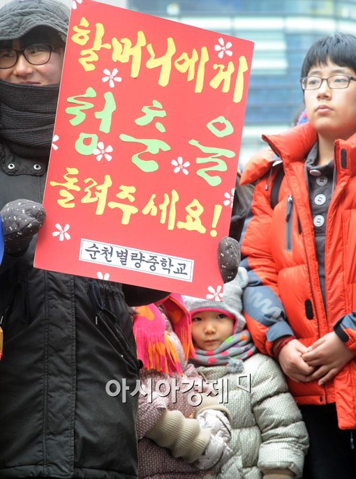 [아시아경제 백소아 기자] 16일 서울 종로구 일본대사관 앞에서 열린 제1057차 일본군 위안부 문재 해결을 위한 정기수요시위에 참석한 한 참석자가 피켓을 들고 있다.백소아 기자 sharp2046@<ⓒ세계를 보는 창 경제를 보는 눈, 아시아경제(www.asiae.co.kr) 무단전재 배포금지>