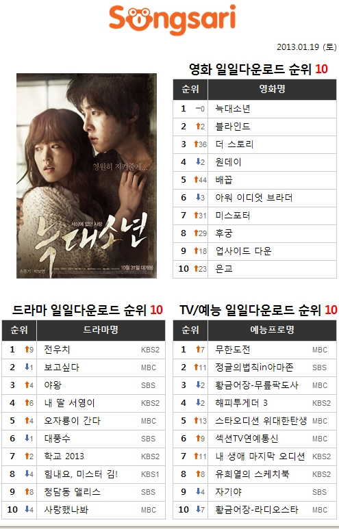 [아시아경제 이금준 기자] 영화 '늑대소년'이 웹하드 다운로드 1위를 기록했다.19일 웹하드 송사리에 따르면 송중기 박보영의 영화 ‘늑대소년’ 이 다운로드 시장에서 여전한 인기를 누리고 있다. 송사리 측은 "17일부터 인터넷으로 다운로드가 가능해진 이후로 다운로드 수가 급격히 증가하면서 계속적으로 증가하는 추세를 보이고 있다"고 전했다.영화부문 2위는 MBC 드라마 '보고싶다'에서 연기력과 스타성을 입증한 유승호와 김하늘이 함께한 영화 '블라인드'가 이름을 올렸다. 유승호의 인기에 힘입어 새삼 다시 주목받고 있다는 분석이다.그뒤로 시공간을 초월하는 여섯 남녀의 '사랑 평행이론'을 3단 액자식 구성으로 담아낸 독특한 스타일의 로맨스 영화 '더 스토리:세상에 숨겨진 사랑' 이 3위로 급상승했다.드라마 부문은 KBS2 드라마 '전우치'와 MBC 드라마 '보고싶다'가 전날의 순위를 바꾸며 각각 1위와 2위를 차지했다. 3위는 14일 첫방으로 순조로운 출발을 보이고 있는 권상우, 수애 주연의 SBS 드라마 '야왕'이 뒤따르고 있다. 예능 부문에서는 MBC '무한도전'이 토요일 예능 최강임을 다시한번 보여주며 1위를 차지했다. 2위는 SBS '정글의법칙in아마존'이 차지했다.이금준 기자 music@<ⓒ아시아경제 & 스투닷컴(stoo.com)이 만드는 온오프라인 연예뉴스>
