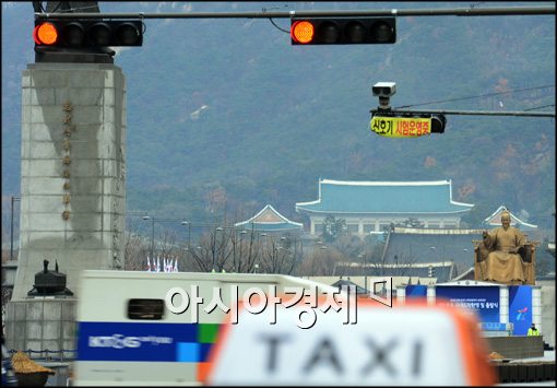 [아시아경제 최우창 기자]정부가 택시를 대중교통 수단으로 인정하는 `대중교통 육성 및 이용촉진법' 개정안(일명 택시법)을 거부하기로 밝힌 가운데 22일 서울 광화문 네거리에서 정차중인 택시와 청와대가 겹쳐 보이고 있다. 최우창 기자 smicer@<ⓒ세계를 보는 창 경제를 보는 눈, 아시아경제(www.asiae.co.kr) 무단전재 배포금지>
