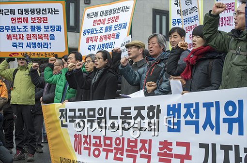 [아시아경제 윤동주 기자] 22일 서울 종로구 삼청동 대통령직 인수위원회 앞에서 공무원노조 회원들이 기자회견을 열고 전국공무원노동조합의 법적지위 인정과 해직자 복직을 촉구하고 있다.윤동주 기자 doso7@<ⓒ세계를 보는 창 경제를 보는 눈, 아시아경제(www.asiae.co.kr) 무단전재 배포금지>