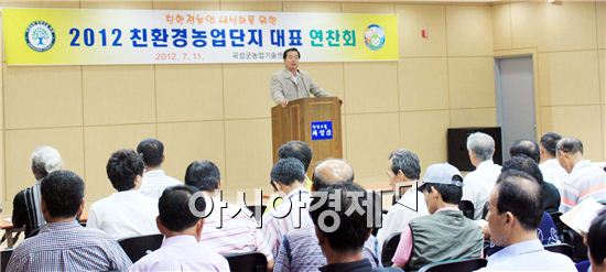 허남석 곡성군수가 친환경농업단지 대표 연찬회에서 인사말을 하고 있다.