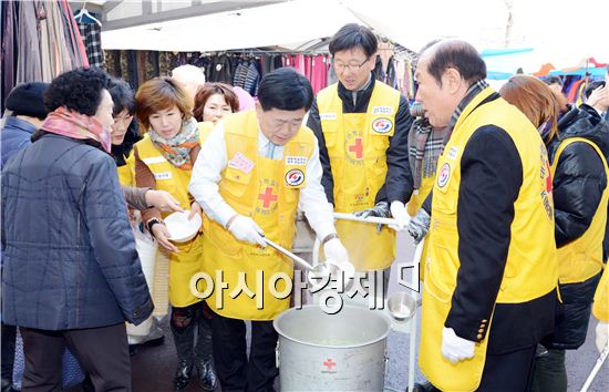 대한적십자 광주·전남지사 순천봉사관(봉사회 순천지구협의회)에서 22일 오전 “2013년 희망 나눔 떡국봉사”를 실시했다.봉사회 소속 28개 단체 150여명의 자원봉사자들이 참여한 이번 “희망 나눔 떡국 봉사”는 아랫장을 이용하는 상인 및 시민 1000여 명이 함께해 성황을 이뤘다.떡국 봉사하는 조충훈 순천시장