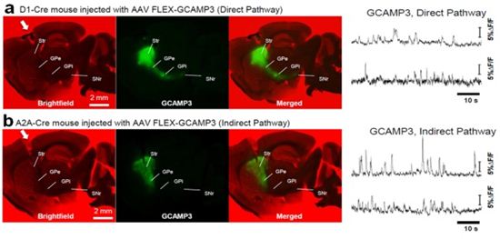 ▲실험동물의 (a)직접경로와 (b)간접경로에 각각 발현된 칼슘 인디케이터와 측정된 형광 신호.[사진제공=교과부]<br />