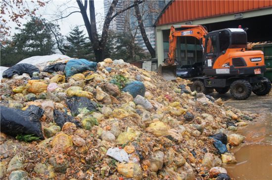 ▲ 23일 오전 서울 관악구 음식물쓰레기 중간적환장(집하장)에서 포크레인 작업인부가 쓰레기를 적재차량에 싣고 있다. 오랜 기간 방치됐던 음식물에 빗물까지 섞여 더 심한 악취를 풍기고 있다.