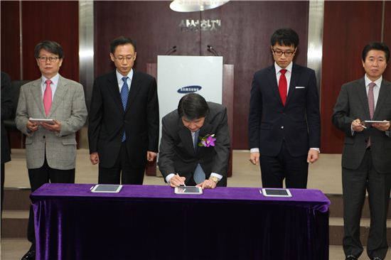 [아시아경제 최일권 기자] 김창수 삼성화재 사장(가운데)이 25일 열린 창립 61주년 기념식에 참석해 '고객서비스헌장'에 서명하고 있다.최일권 기자 igchoi@<ⓒ세계를 보는 창 경제를 보는 눈, 아시아경제(www.asiae.co.kr) 무단전재 배포금지>