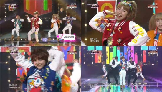 [아시아경제 황원준 기자]신인 걸 그룹 타이니지(TINY-G)가 중독성 강한 멜로디로 팬들의 눈길을 끌었다.타이니지는 25일 오후 방송한 KBS2 '뮤직뱅크'에 출연해 신곡 '미니마니모' 무대를 선사했다.이들은 이날 각자의 개성이 돋보이는 무대의상과 신인답지 않은 자신감 있는 무대로 팬들의 이목을 사로잡았다. 특히 중독성 강하고 재미있는 가사와 깜찍한 안무는 팬들의 호응을 이끌어냈다.'미니마니모'는 남자친구에게 다시 내게로 돌아오라는 바람과 이제 그만 사라져달라는 바람, 두 가지로 해석이 가능한 타이니지 만의 주문을 뜻하는 말로, '미리미리 차라차라'와 같은 개성 넘치는 가사는 타이니지의 당당함을 보여줌과 동시에 쉽고 재미있는 라임으로 중독성을 자랑하고 있다.한편 이날 방송에는 인피니트H, 배치기, 소녀시대, 씨엔블루, 보이프렌드, 문희준, 투윤, 헬로비너스, 글램, 팬텀, 에어플레인, 디셈버, 빅스, 타이니지, 스피드, 이고밤, 먼데이키즈, 나인뮤지스, 익사이트, 크레용팝, 미스터미스터 등이 출연했다.황원준 기자 hwj1012@<ⓒ아시아경제 & 스투닷컴(stoo.com)이 만드는 온오프라인 연예뉴스>