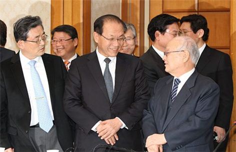 28일 국회에서 열린 연석회의에서 김용준 총리 후보자 겸 인수위원장(오른쪽)과 새누리당 황우여 대표(가운데), 이한구 원내대표(왼쪽)이 환담을 나누고 있다.[사진제공=새누리당]