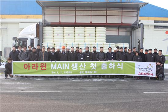 경북 구미사업장에서 열린, 웅진케미칼㈜ 아라미드섬유 메인생산 첫 출하식 모습.
