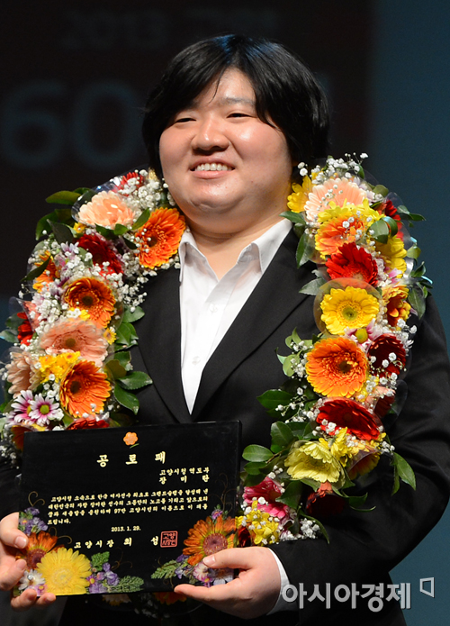 [고양=아시아경제 정재훈 기자] 역도여제 장미란이 29일 오후 고양 어울림누리 어울림극장에서 열린 은퇴식에서 공로패를 받은 뒤 포즈를 취하고 있다.정재훈 기자 roze@<ⓒ세계를 보는 창 경제를 보는 눈, 아시아경제(www.asiae.co.kr) 무단전재 배포금지>