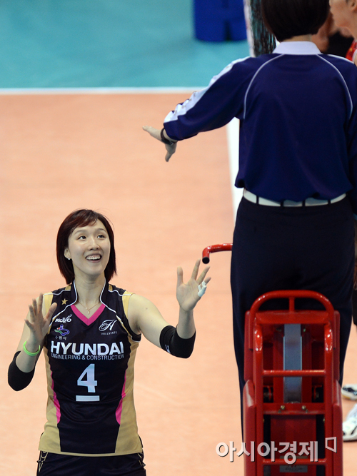 [수원=아시아경제 정재훈 기자] 29일 오후 수원실내체육관에서 열린 'NH농협 2012~2013 V리그' 현대건설과 KGC의 경기에서 황연주가 판정에 항의하고 있다.정재훈 기자 roze@<ⓒ세계를 보는 창 경제를 보는 눈, 아시아경제(www.asiae.co.kr) 무단전재 배포금지>정재훈 사진기자 roze@<ⓒ아시아 대표 석간 '아시아경제' (www.newsva.co.kr) 무단전재 배포금지>