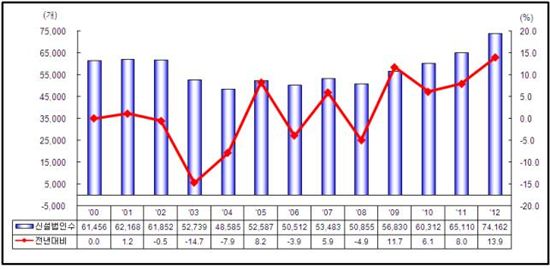 [아시아경제 김대섭 기자] 중소기업청은 지난해 연간 신설법인수가 7만4162개로 전년(6만5110개)대비 13.9%(9052개) 증가한 것으로 조사됐다고 30일 밝혔다. 신설법인 통계 집계를 시작한 2000년 이후 최대치다. 지난해 12월 신설법인은 5784개로 전월비로는 3.4%(203개) 감소했다.중기청이 발표한 2012년 연간 신설법인 동향에 따르면, 업종별로는 전년대비 제조업(14.0%, 2176개), 서비스업(14.9%, 6082개), 건설업(6.1%, 403개) 모두 증가한 것으로 나타났다. 연령대별로 살펴보면 전년대비 모든 연령대에서 증가했다. 특히 30세미만(24.3%), 50대(17.4%)에서 크게 증가한 것으로 조사됐다. 이는 스마트기기 확산에 따른 전자상거래 시장의 성장으로 청년층에 유리한 창업환경이 조성됐고 베이비부머 세대의 창업활동이 활발해 진 것에 따른 것으로 분석됐다.성별로는 전년대비 여성은 17.8%(2534개), 남성은 12.8%(6518개) 늘어났고 비중은 전년대비 여성이 0.8%p 증가했다. 자본금규모별로는 전년대비 10억 초과~50억 이하(18.2%), 50억 초과(18.2%), 5000만원 이하(16.7%) 등 모두 구간에서 증가했다. 한편 지난해 12월 신설법인 동향을 살펴보면, 업종별로 전월비로 제조업, 건설업, 서비스업 모두 감소했다. 전년동월비로도 모두 감소해 제조업은 14개월, 건설업은 11개월, 서비스업은 22개월 만에 감소세로 전환한 것으로 집계됐다.김대섭 기자 joas11@<ⓒ세계를 보는 창 경제를 보는 눈, 아시아경제(www.asiae.co.kr) 무단전재 배포금지>