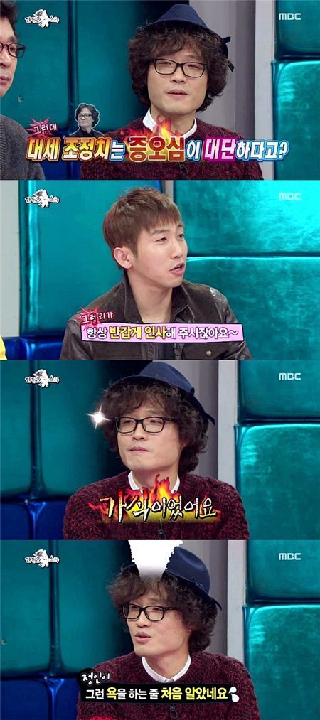 [아시아경제 이금준 기자] 그룹 신치림의 멤버 조정치가 유세윤을 싫어하는 이유를 공개했다.조정치는 30일 밤 방송한 MBC '황금어장-라디오스타'에 출연해 "유세윤을 싫어했다"고 고백해 주위를 깜짝 놀라게 만들었다. 이어 그는 "평소에 반갑게 인사하고 그러지 않느냐"고 묻는 유세윤을 향해 "가식이었다"고 말해 웃음을 자아냈다.조정치는 또한 "정인이 옹달샘이 '최고의 연예인'이라면서 좋아할 때였다. 유세윤을 길거리에서 보고 '팬이에요'라고 했는데 그냥 택시를 타고 가버렸다. 정인이 그런 욕을 할 줄 아는지 그 때 처음 알았다"는 말로 다시 한번 스튜디오를 웃음바다로 만들었다.한편 고(故) 김광석 특집으로 진행된 이날 '라디오스타'에는 한동준, 조정치, 홍경민이 출연해 입담을 과시했다.이금준 기자 music@<ⓒ아시아경제 & 스투닷컴(stoo.com)이 만드는 온오프라인 연예뉴스>